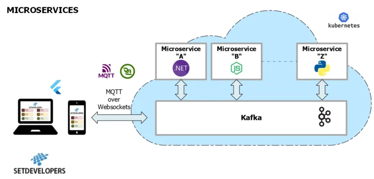 Cada Microservicio que proponemos y desarrollamos lo enfocamos a solucionar una tarea específica y los interrelacionamos entre ellos habitualmente mediante el software de streaming de mensajería Kafka.